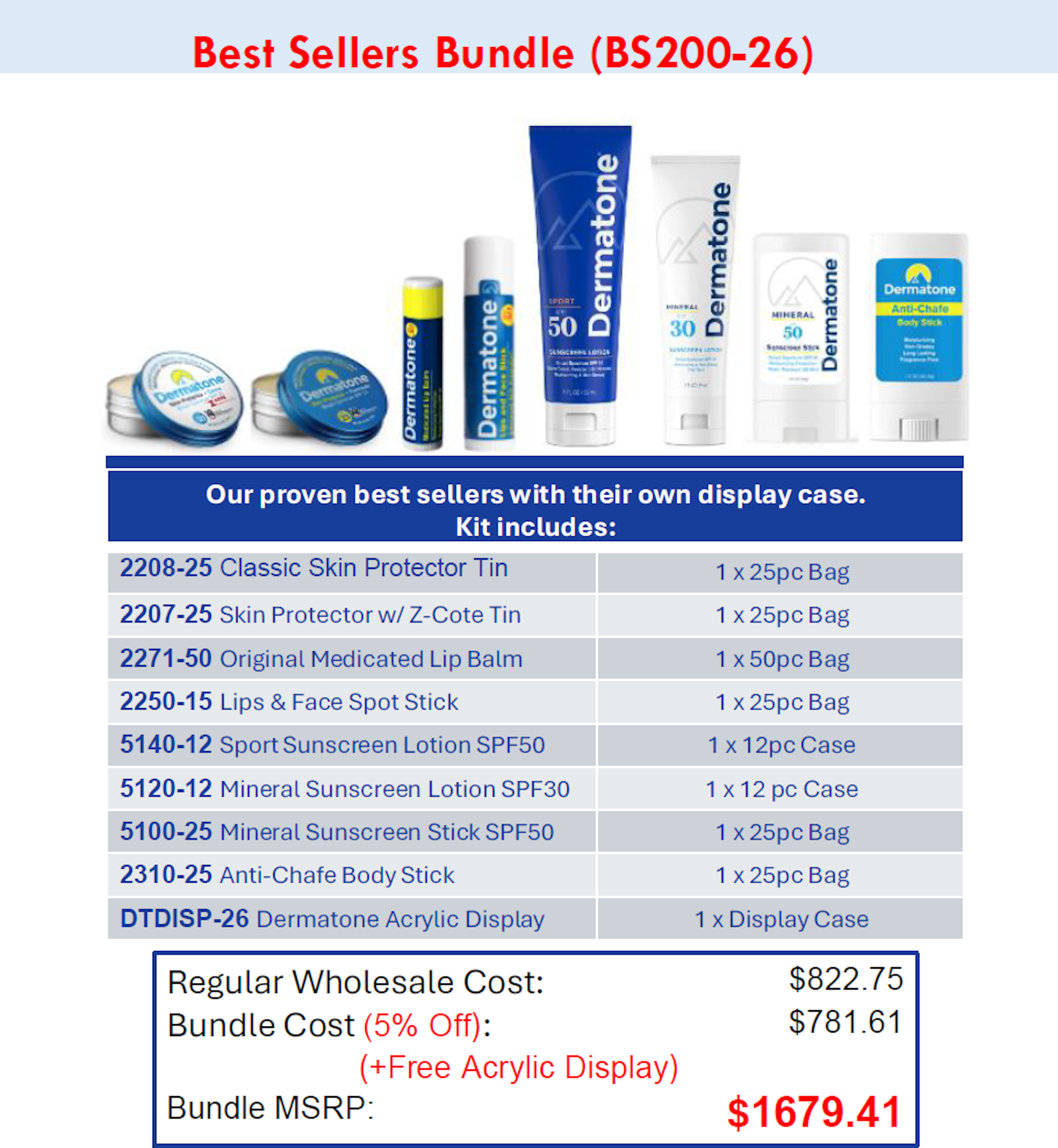 A Dermatone Bundle containing all of Dermatone's best sellers. This bundle ensures your store is ready for all different types of issues customers may come in with with a convenient one brand answer. Whether its the dead of winter or a hot summer day at the beach your customers will be covered with this Best Sellers Bundle. This bundle also comes with a free Acrylic Display to ensure you have a proper way to showcase these products!