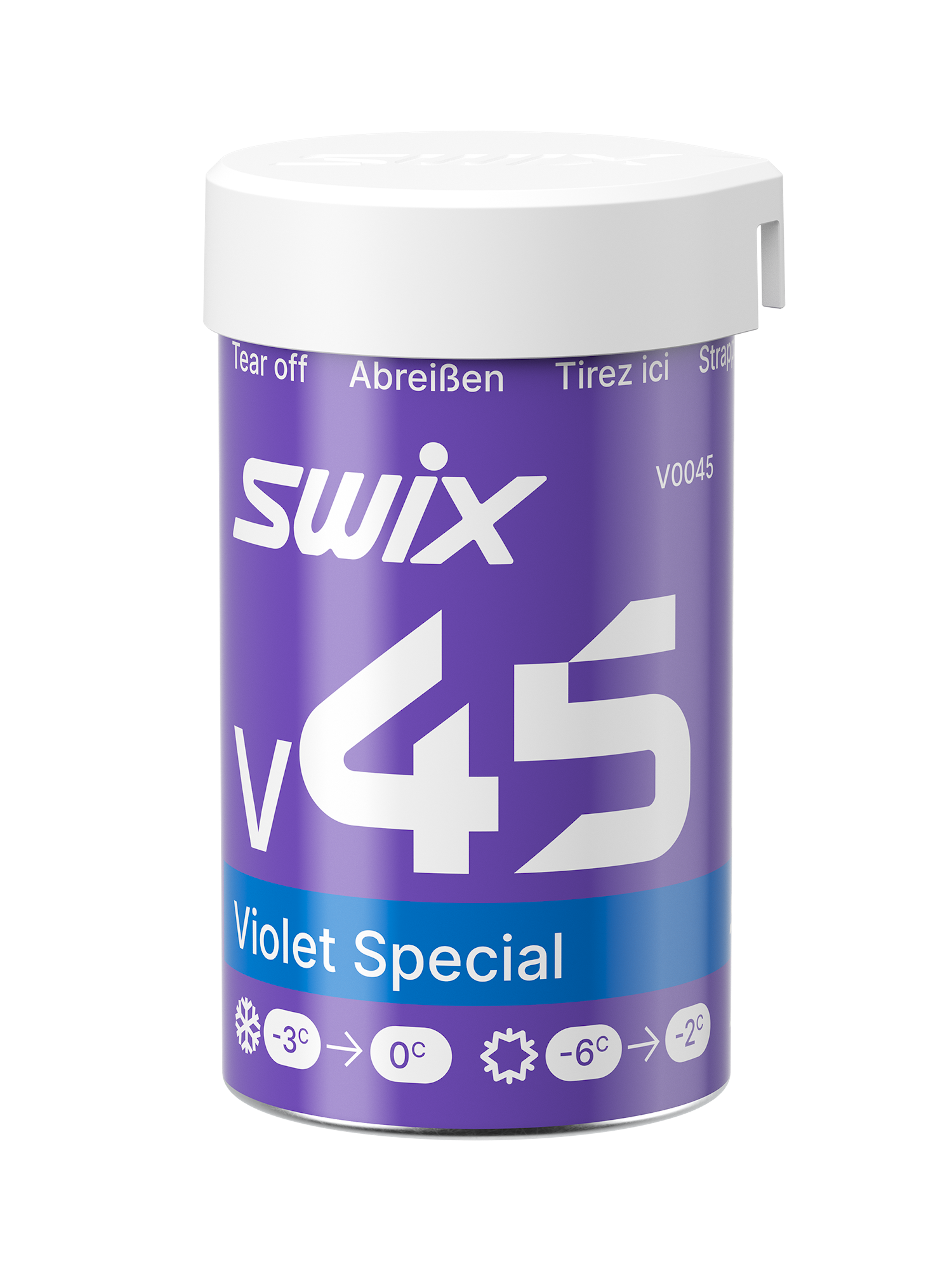 Swix V45 Violet Special är en nyckelvaxa för vinterförhållanden nära 0°C. När V40 Blue Extra inte längre ger optimalt grepp ger Violet Special tillförlitlig prestanda i ny, fallande snö från 0 °C till -3 °C och i gammal eller omvandlad snö från -2 °C till -6 °C. Utvecklad för både racing och touring.