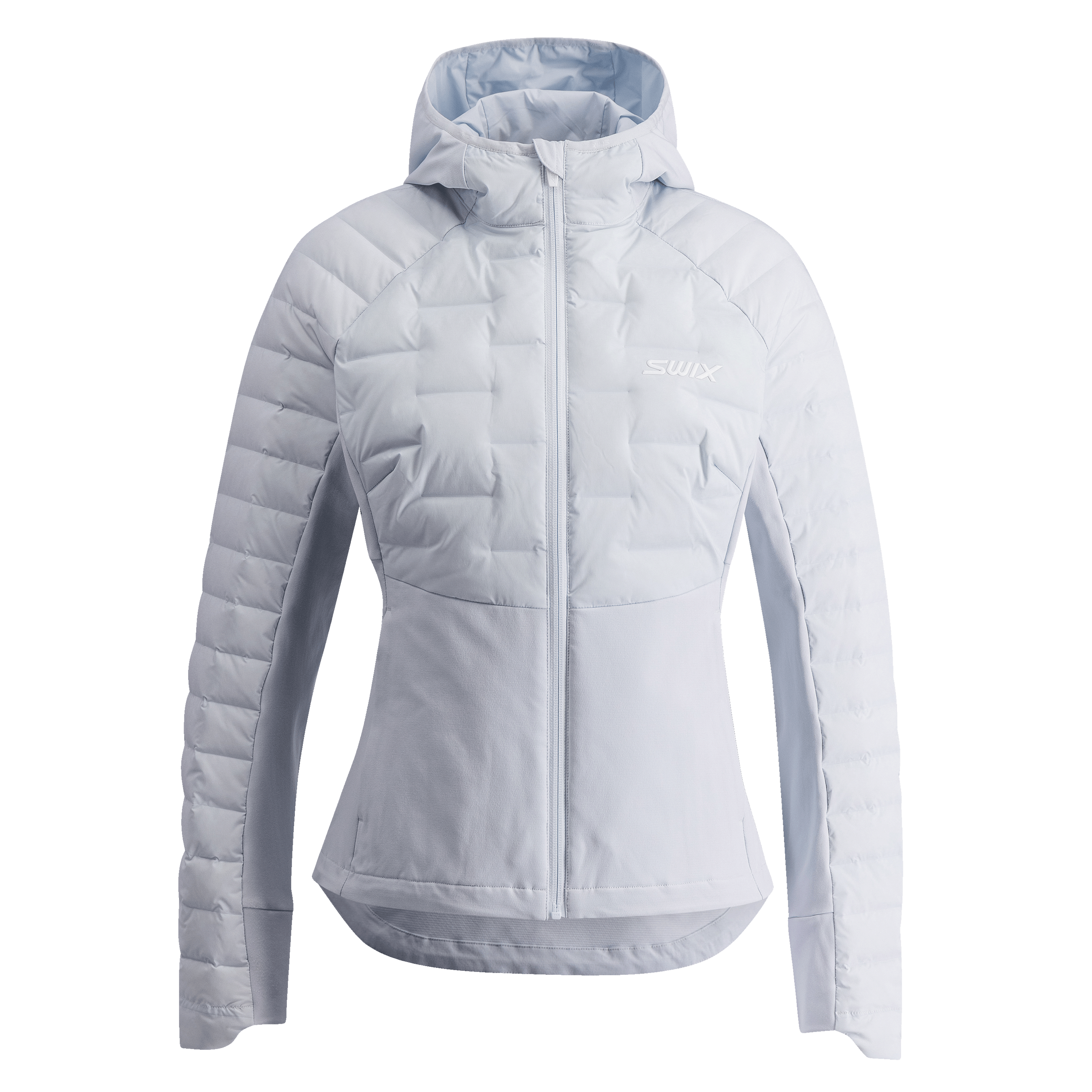 Swix Horizon Jacket Women is a warm, technical cross-country skiing jacket built for cold winter training. Insulated panels at the front and shoulders, filled with 90/10 down and lightweight sheet insulation, provide warmth without bulk. Elastic panels with a brushed backside enhance freedom of movement and allow heat to escape during activity. With an adjustable hem, two hand pockets, and a zippered chest pocket, this jacket combines warmth, comfort, and functionality for dedicated winter athletes.