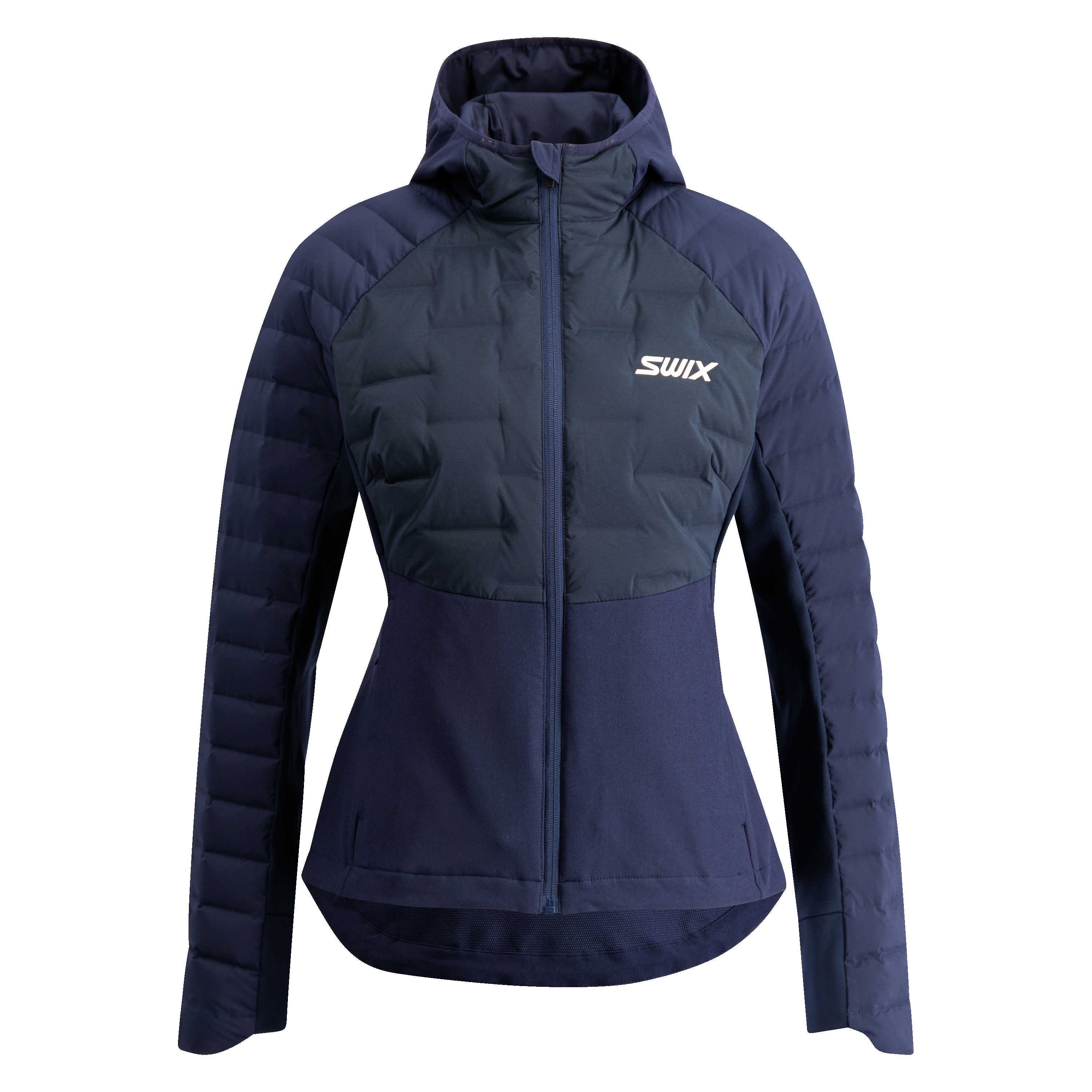 Swix Horizon Jacket Women is a warm, technical cross-country skiing jacket built for cold winter training. Insulated panels at the front and shoulders, filled with 90/10 down and lightweight sheet insulation, provide warmth without bulk. Elastic panels with a brushed backside enhance freedom of movement and allow heat to escape during activity. With an adjustable hem, two hand pockets, and a zippered chest pocket, this jacket combines warmth, comfort, and functionality for dedicated winter athletes.