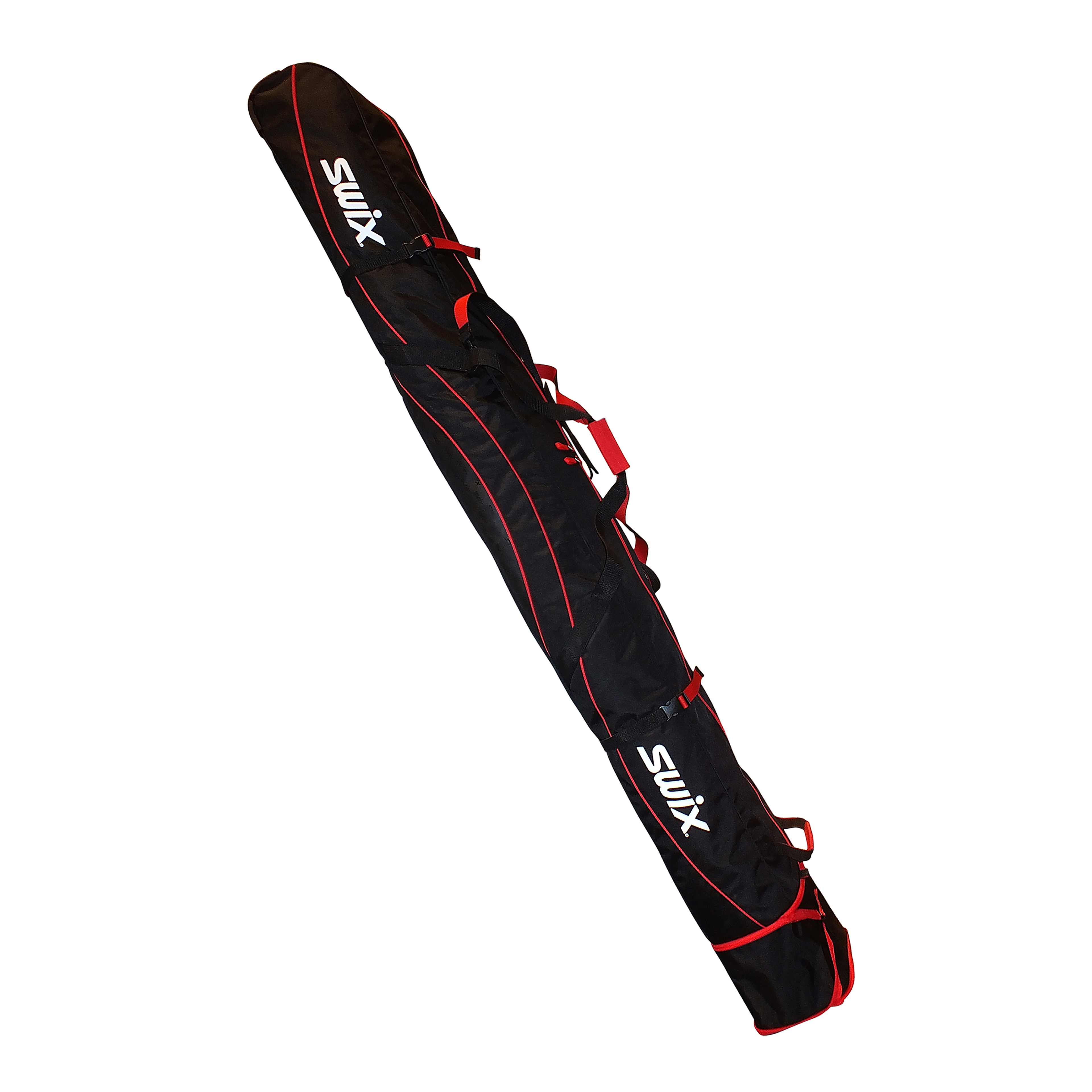 Double ski bag with wheels that accommodates up to 8 pairs of cross-country skis or 2 pairs of alpine skis. Sturdy straps with grommets for strength on adjustable shoulder straps and handles.