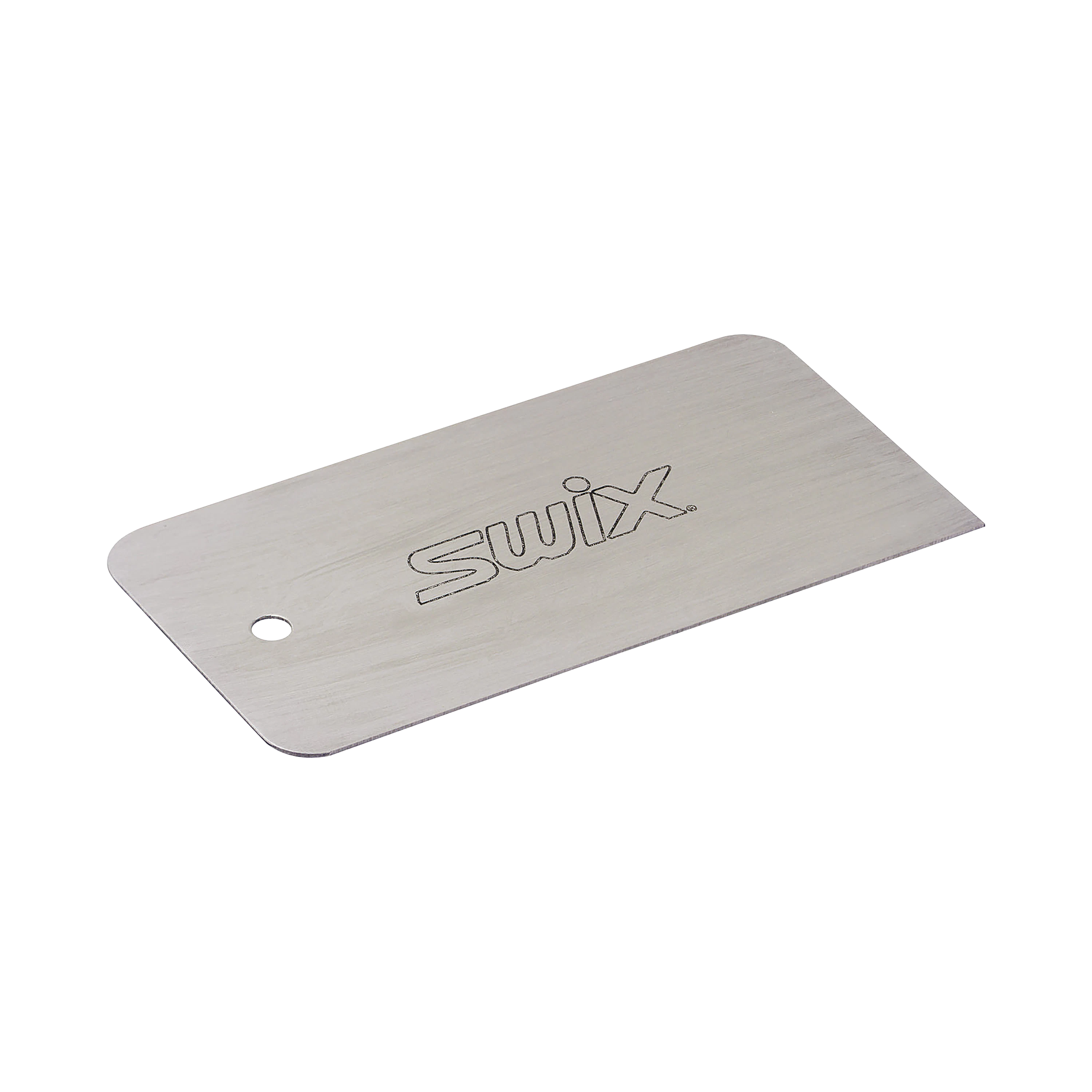 Steel scraper for scraping down the ski base before laying a new structure. Size: 125 mm x 62 mm x 1 mm.